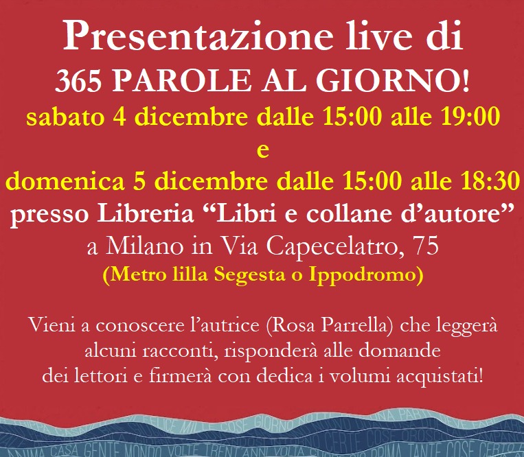 La mia prima volta. Ognuno di noi, fino alla fine, avrà innumerevoli prime volte. Anche la nostra morte, in questa vita, sarà la prima (e l’ultima) volta. Fino alla fine, vivremo una serie di splendide, memorabili, indimenticabili prime volte. Secondo me, le prime volte non possono mai essere brutte. Fosse anche solo per il fatto che ci preparano a seconde e terze e altre volte che potrebbero pure essere migliori. Tante volte, di tutto, comunque, è un buon augurio; nel male e nel bene. Perché è così che dev’essere. E allora è arrivata anche la mia prima volta da scrittrice a presentare il mio primo libro (essì… perché ho deciso di scriverne altri, indipendentemente da come andrà questo). Una libreria bellissima nel cuore di San Siro, ospiterà 365 PAROLE AL GIORNO per 2 giorni. In via Capecelatro 75, presso la libreria “Libri e collane d’autore” mi troverete il 4 e 5 dicembre (dalle 15:00 alle 18:30) per parlare, scherzare, ricordare, ascoltarmi leggere (se non svengo…), e farvi firmare con dedica PERSONALIZZATA, il vostro 365 PAROLE AL GIORNO. Vi aspetto! A chi verrà, regalerò un piccolo pensierino a tema!