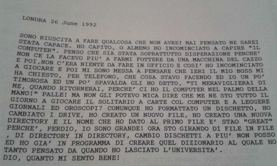 La devo smettere di cercare fotografie, porcazzozza. Stavo spulciando Facebook a caccia di una foto di mamma col cane e, a un certo punto, m’è arrivata davanti ‘sta schermata. Non ci posso credere. Non posso credere che, a un certo punto della mia vita, esattamente trent’anni anni fa, io ho imparato a usare i computer e ho scritto “ho il computer nel palmo della mano”. Qua, vedi, riconosco le mie capacità medianiche ed extra-sensoriali che mi facevano già immaginare e prevedere ciò che esattamente trent’anni dopo sarebbe successo; tutti col computer in mano, che poi sarebbe stato il mitico cellulare. E chi l’avrebbe mai pensato che, mentre scrivevo con DOS e stampavo quello che avevo scritto per la prima volta, da computer a stampante (D eufoniche sbagliate incluse), poi mi sarebbe saltato davanti agli occhi oggi? Quel foglio, sicuramente, ce l’ho da qualche parte ancora, conservato. Ne sono sicura. Io, come nonna Rosa che tutti criticavano perché teneva perfino lo spago lungo mezzo centimetro, conservo tutto; soprattutto nel cuore. Devo dire la verità, però. Non avevo conservato il senso di ebbrezza e conquista che la perseveranza, la pazienza, l’applicazione e la cazzimma (mio pregio e difetto al contempo, inestimabile e inopinabile, lo ammetto) ti fanno provare quando non molli l’osso, non ti fermi e non ti arrendi. Immaginare quella Rosa che, in un vecchio ufficio di Londra, trent’anni fa, armeggia con computer, stampanti e tant’altro ancora, sorridendo e incazzandosi a tratti, mi è familiare. La riconosco quando dice che la prima cosa che ha fatto con l’aggeggio infernale è stato di imparare a giocare al solitario. Lei è così. Per imparare bene qualcosa deve prima toccare, vedere, percepire le gratificanti particolarità di quel pezzo di vita. Deve prima capire cosa di bello ne potrebbe venire fuori, per impegnarci, poi, tutta l’energia che può, per imparare a conoscerla, apprezzarla. Non facciamo tutti così? Sì, questo, a parte la resilienza, è ciò che mi colpisce dello scritto: che per concentrare le mie energie su qualcuno o qualcosa, io debba sempre e comunque prima capire cosa di buono c’è in questa persona o cosa, sperimentandola. Del resto, come diceva la pubblicità: “A scatola chiusa compro solo Arrigoni”, no?